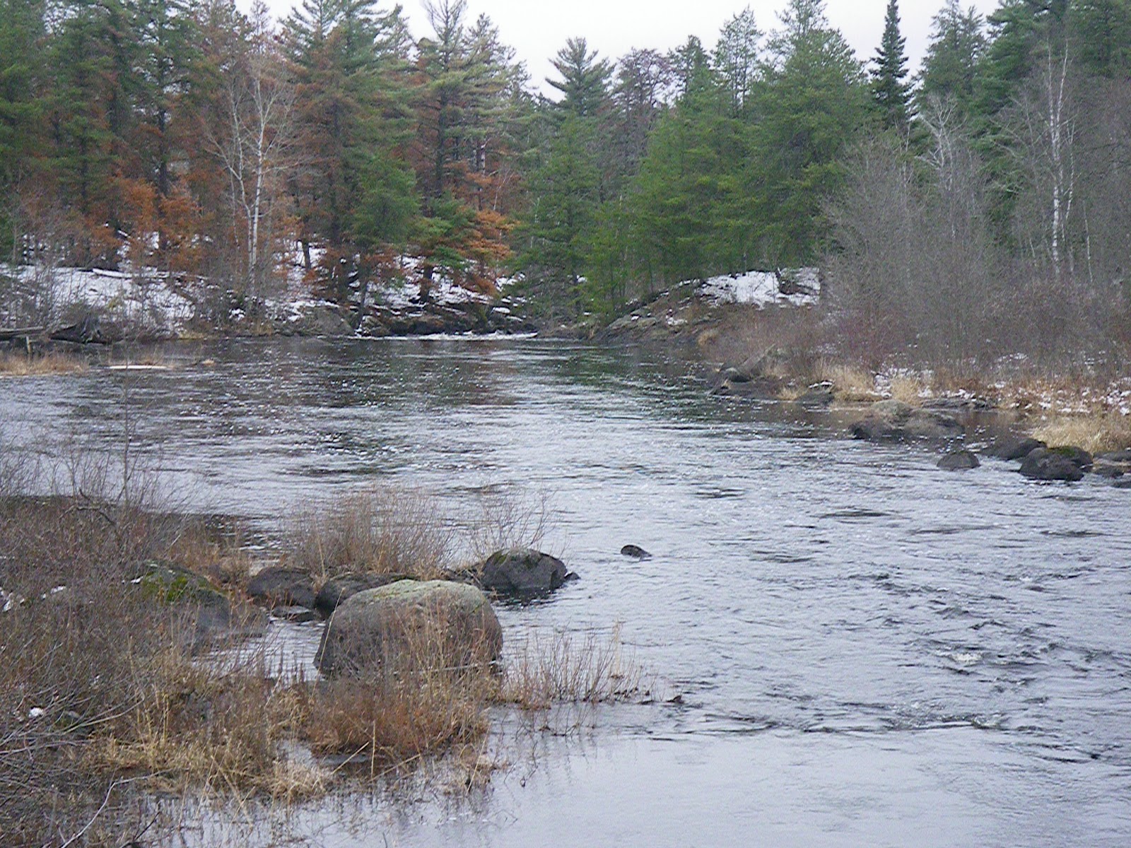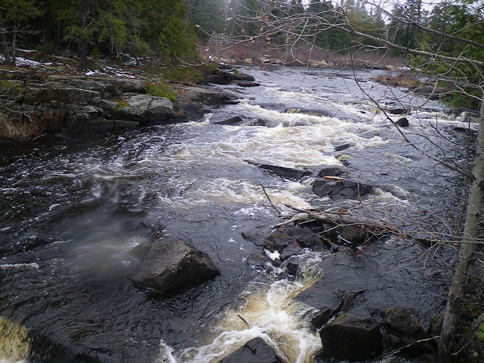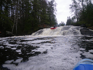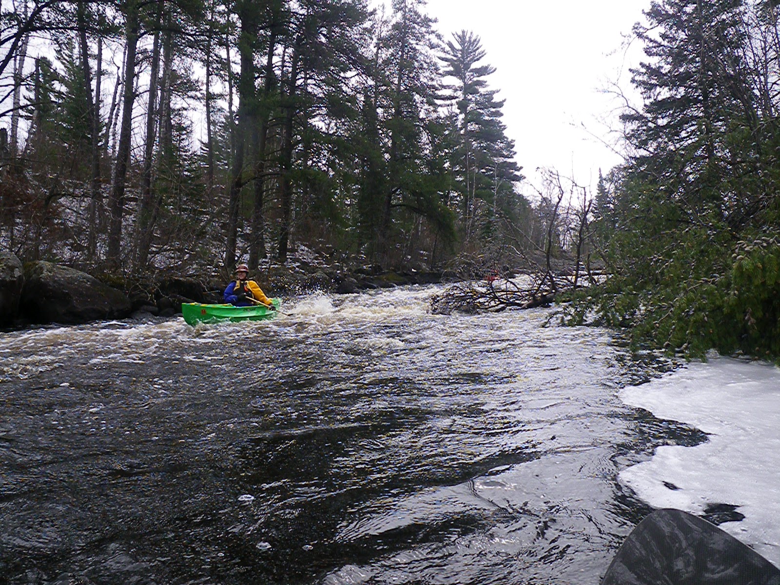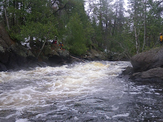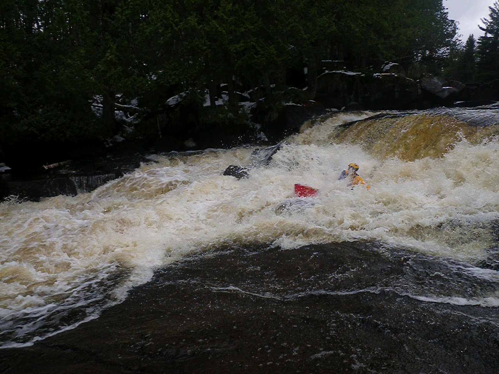 The crew for the day ended up being Dan, Dave, Andy, Ken, Tony and I. From the cities it was a 4 1/2 hour drive north…5 1/2 for me from home. We made good time and put on just before noon. The River was a tad bit lower than the day before. The first sluice was low water but fun bumping down. We rock dodged and just a short distance further we could see the first horizon line. Trying to make it over through the rocks was difficult. My boat spun backwards around rocks but I made it into the eddy. The water was low.