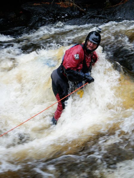 OK. I took stock. The boys are now rock climbing up river with throw bags to get me. Looking around I knew if I left my boat it would be very hard to retrieve it. I knew at the moment I was safe and had time to work with it. I tried to move the boat but it wouldn’t move even a fraction. Ken had stayed in his kayak below me and I caught his eye and threw my paddle to him. Paddle was safe. Then Dave threw a great shot with the throw rope to me. By then I had found a rock behind my boat to stand on. The water coming over the boat was ice cold and still pushing me hard so I had to hang on with one hand and try to tie something off on the boat with the rope. All I could find was my back band rope. Well better than nothing. My heat and strength was leaving me very fast. My hands in my gloves were not working very well and I was starting to shake. I wanted the boys to throw me a bag with a carabiner on it but communication for me was difficult. They knew I wanted a biner so they slid one down the rope to me. I was getting even colder and weaker. I didn’t have the ability or strength to clip the carabiner on the end of the bag so I just clipped it onto the back grab handle. That was it. It wasn’t on good enough to try pulling but it was on the boat. I couldn’t do any more at that point.