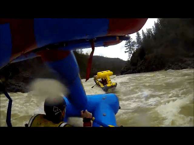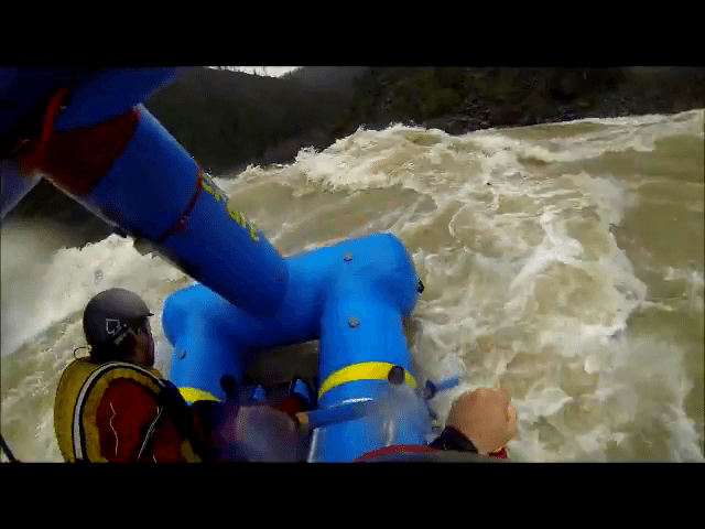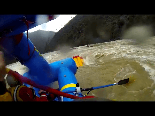 Nonetheless, after a few hours of blowing up boats and rigging we were off. It was about 12:30 PM. The first 12 miles were fairly uneventful if you tried to stay out of the features. Matt tested his boat out in a enormous wave and was flipped right off the bat. He was in an R-3 setup and with new people to the Creature Craft world as his paddlers he was unable to roll. Eventually they figured it out, but only by having Matt unstrap and use his weight to right the boat. R-3 set ups are great if everyone is working together, but it exposes your paddlers to the river, and it can be a difficult maneuver to complete under stress. His two paddlers, although experienced, had never seen this type of water.